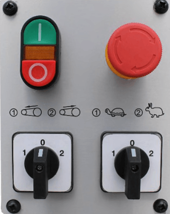 • Панель управления размещена на стойке станка и имеет возможность регулировать скорость вращения ленты, а также изменять направление вращения ленты.
