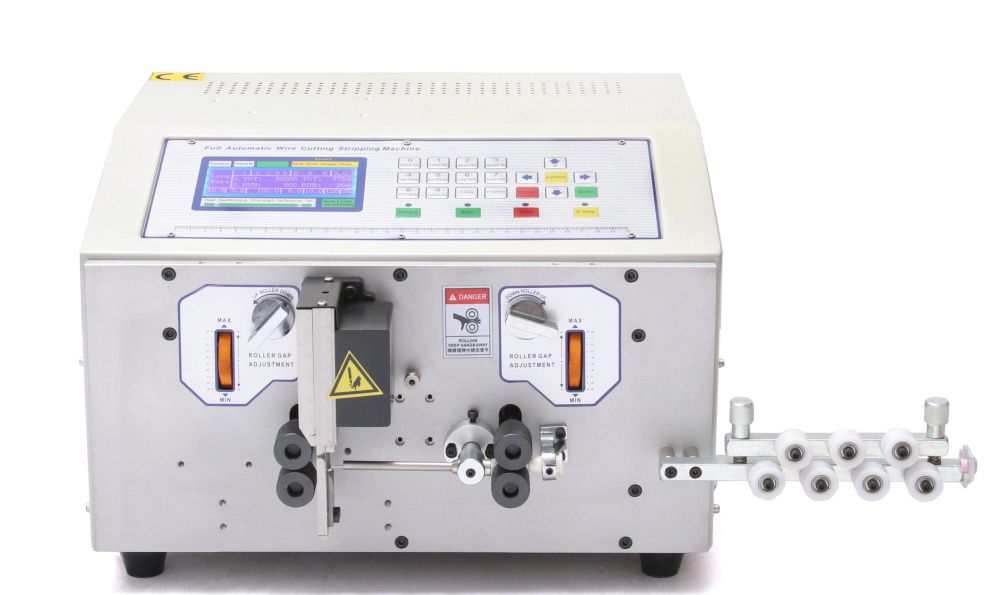 Автоматическая машина с 4-мя роликами для перемещения проводов в диапазоне сечений от 0,1-4,0 мм2 . Необходимо только установить длину реза и зачистки для каждой из сторон, а так же общую сумму резов, после чего машина сделает все автоматически.